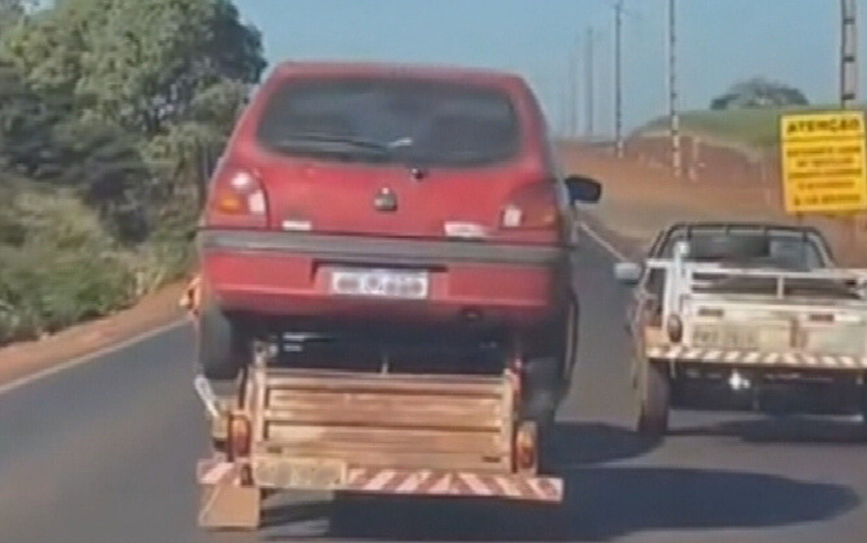 Um carro foi filmado transportando outro carro em cima de uma carretinha na GO-164, em Quirinópolis, na região sudoeste de Goiás.
